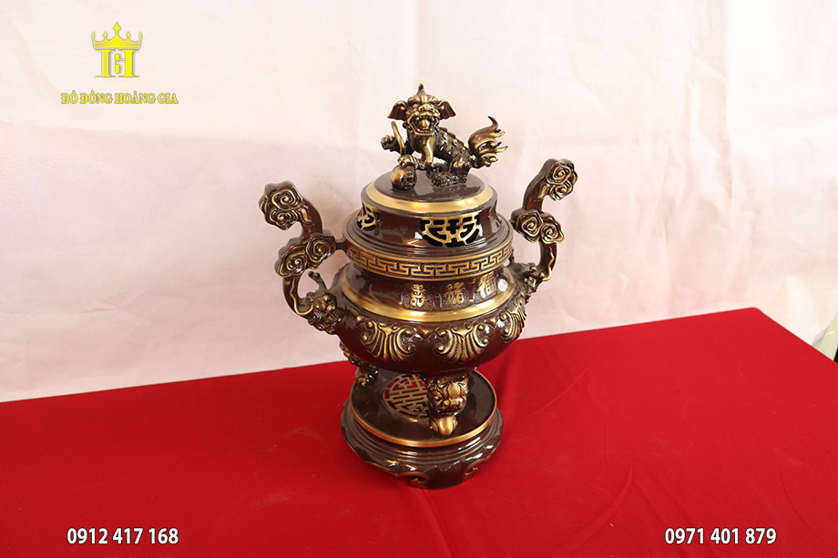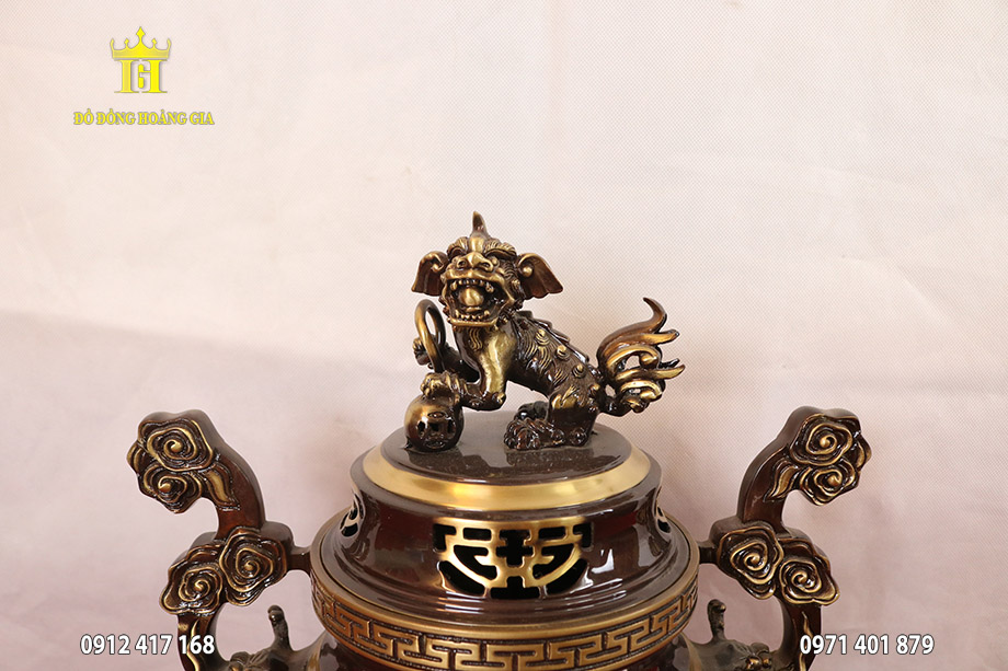 Đỉnh đồng hoa sòi màu hun highlight của đồ đồng Hoàng gia là vật phẩm dùng để trang trí, thờ cúng, nó thường được đặt tại phòng khách, phòng thờ gia tiên, dòng tộc hay trong đình chùa miếu mạo. Sản phẩm thường để dùng đốt trầm hương, là nơi thể hiện lòng thành kính của con cháu đối với thế hệ cha ông đi trước.