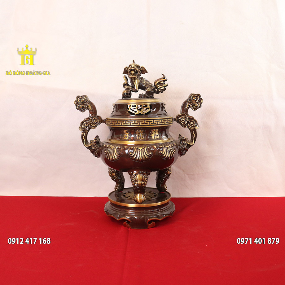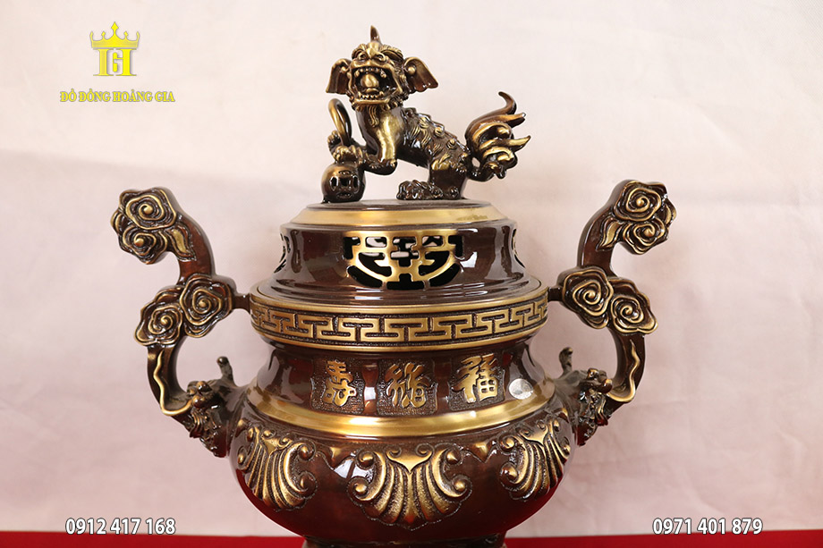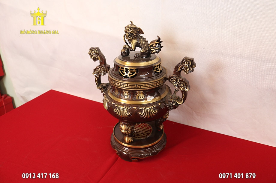 Đỉnh đồng hoa sòi màu hun highlight - Đồ đồng Hoàng gia được đúc hoàn toàn thủ công bằng đồng nguyên chất, bên ngoài hun highlight. Đây là vật phẩm có vai trò vô cùng quan trọng nằm trong bộ đồ thờ trên bàn thờ gia tiên, dòng tộc.